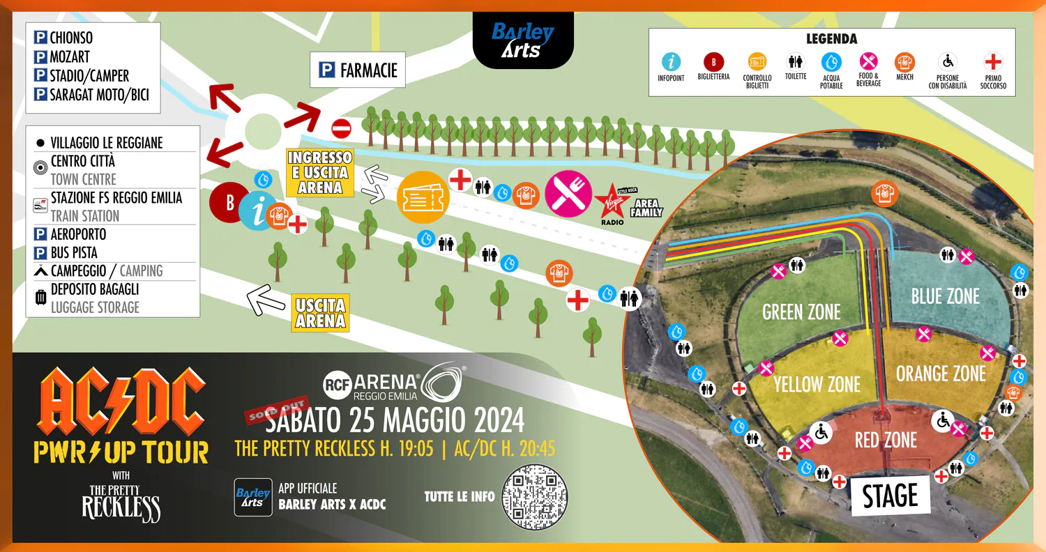 Il settore al quale si potrà accedere è unicamente quello indicato sul proprio biglietto (Red Zone, Yellow Zone, Orange Zone, Green Zone, Blue Zone). Non sarà possibile fare cambi di settore. Ogni zona è fornita di propri punti ristoro, bar, merchandising, servizi igienici. Una volta avuto accesso all’Arena non sarà più possibile uscire fino al termine del concerto.